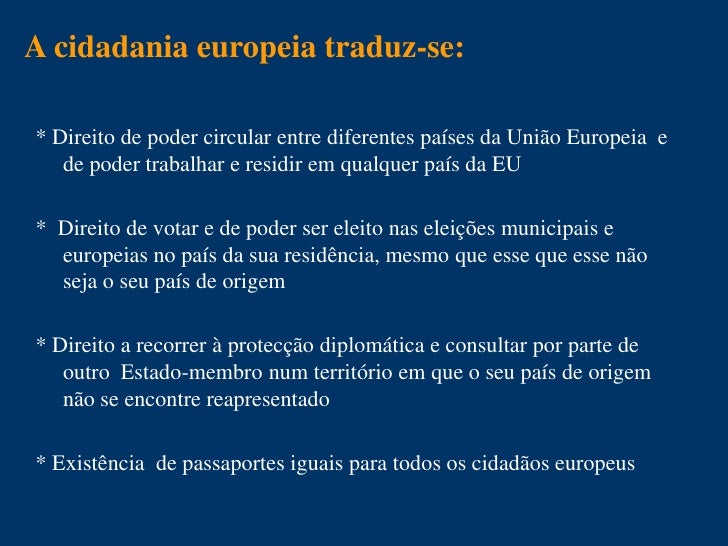 6. 6. A cidadania europeia traduz-se:<br />* Direito de poder circular entre diferentes países da União Europeia e de poder trabalhar e residir em qualquer país da EU<br />* Direito de votar e de poder ser eleito nas eleições municipais e europeias no país da sua residência, mesmo que esse que esse não seja o seu país de origem <br />* Direito a recorrer à protecção diplomática e consultar por parte de outro Estado-membro num território em que o seu país de origem não se encontre reapresentado<br />* Existência de passaportes iguais para todos os cidadãos europeus <br />