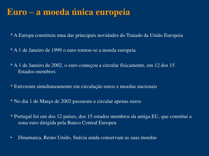 7. 7. Euro – a moeda única europeia<br />* A Europa constituiu uma das principais novidades do Tratado da União Europeia<br />* A 1 de Janeiro de 1999 o euro tornou-se a moeda europeia<br />* A 1 de Janeiro de 2002, o euro começou a circular fisicamente, em 12 dos 15 Estados-membros <br />* Estiveram simultaneamente em circulação euros e moedas nacionais<br />* No dia 1 de Março de 2002 passaram a circular apenas euros <br />* Portugal foi um dos 12 países, dos 15 estados membros da antiga EU, que constitui a zona euro dirigida pela Banco Central Europeu<br />Dinamarca, Reino Unido, Suécia ainda conservam as suas moedas <br />