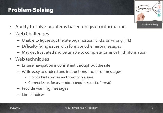 10. 10. Problem-Solving• Ability to solve problems based on given information• Web Challenges – Unable to figure out the site organization (clicks on wrong link) – Difficulty fixing issues with forms or other error messages – May get frustrated and be unable to complete forms or find information• Web techniques – Ensure navigation is consistent throughout the site – Write easy to understand instructions and error messages • Provide hints on use and how to fix issues • Correct issues for users (don’t require specific format) – Provide warning messages – Limit choices2/28/2013 © 2013 Interactive Accessibility 10