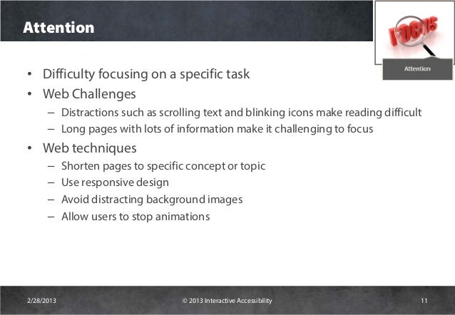 11. 11. Attention• Difficulty focusing on a specific task• Web Challenges – Distractions such as scrolling text and blinking icons make reading difficult – Long pages with lots of information make it challenging to focus• Web techniques – Shorten pages to specific concept or topic – Use responsive design – Avoid distracting background images – Allow users to stop animations2/28/2013 © 2013 Interactive Accessibility 11