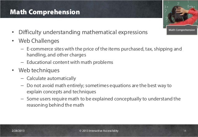 14. 14. Math Comprehension• Difficulty understanding mathematical expressions• Web Challenges – E-commerce sites with the price of the items purchased, tax, shipping and handling, and other charges – Educational content with math problems• Web techniques – Calculate automatically – Do not avoid math entirely; sometimes equations are the best way to explain concepts and techniques – Some users require math to be explained conceptually to understand the reasoning behind the math2/28/2013 © 2013 Interactive Accessibility 14