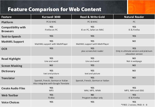 17. 17. Feature Comparison for Web ContentFeature Kurzweil 3000 Read & Write Gold Natural ReaderPlatform PC & MAC PC & MAC PCCompatibility with YES YES YES Firefox on PC IE on PC, Safari on MAC IE & FirefoxBrowsersText-to-Speech YES YES YESMathML Support YES YES NO MathML support with MathPlayer MathML support with MathPlayerOCR YES YES YES plus screenshot reader Only in ultimate version and platinum education versionRead Highlight YES YES NO Line and word Line and word Not in webpageScreen Masking NO YES NODictionary YES YES NO text and picture text and pictureTranslator YES YES NO Spanish, French, German or Italian Spanish, French, German or Italian Also integrates with Google TranslateCreate Audio Files YES YES YES MP3 WAV, MP3, WMA MP3, WAV and OGGWeb Toolbar YES NO YES Firefox Program toolbar only IE & FirefoxVoice Choices YES YES YES *FREE: 2 voices; PAID: 4 - 8