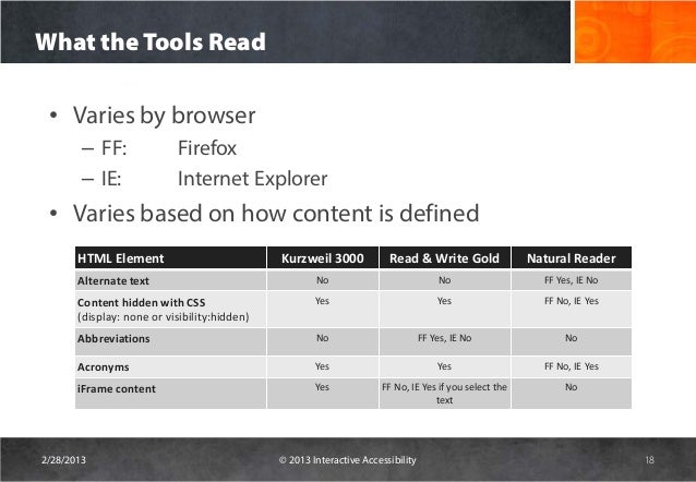 18. 18. What the Tools Read • Varies by browser – FF: Firefox – IE: Internet Explorer • Varies based on how content is defined HTML Element Kurzweil 3000 Read & Write Gold Natural Reader Alternate text No No FF Yes, IE No Content hidden with CSS Yes Yes FF No, IE Yes (display: none or visibility:hidden) Abbreviations No FF Yes, IE No No Acronyms Yes Yes FF No, IE Yes iFrame content Yes FF No, IE Yes if you select the No text2/28/2013 © 2013 Interactive Accessibility 18