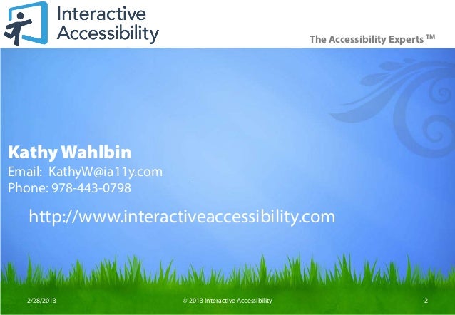 2. 2. The Accessibility Experts TMKathy WahlbinEmail: KathyW@ia11y.comPhone: 978-443-0798 http://www.interactiveaccessibility.com 2/28/2013 © 2013 Interactive Accessibility 2