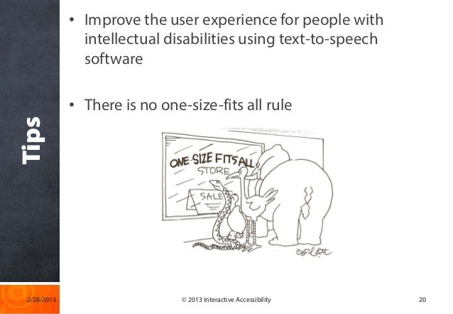 20. 20. • Improve the user experience for people with intellectual disabilities using text-to-speech software • There is no one-size-fits all ruleTips 2/28/2013 © 2013 Interactive Accessibility 20