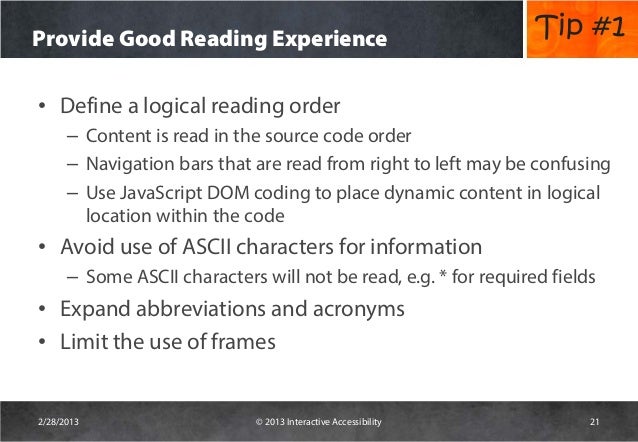 21. 21. Provide Good Reading Experience Tip #1• Define a logical reading order – Content is read in the source code order – Navigation bars that are read from right to left may be confusing – Use JavaScript DOM coding to place dynamic content in logical location within the code• Avoid use of ASCII characters for information – Some ASCII characters will not be read, e.g. * for required fields• Expand abbreviations and acronyms• Limit the use of frames2/28/2013 © 2013 Interactive Accessibility 21