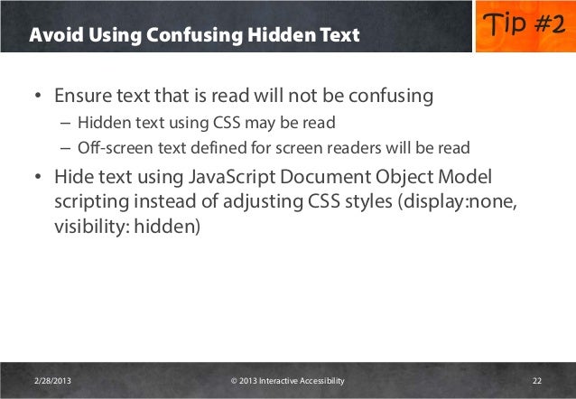 22. 22. Avoid Using Confusing Hidden Text Tip #2• Ensure text that is read will not be confusing – Hidden text using CSS may be read – Off-screen text defined for screen readers will be read• Hide text using JavaScript Document Object Model scripting instead of adjusting CSS styles (display:none, visibility: hidden)2/28/2013 © 2013 Interactive Accessibility 22