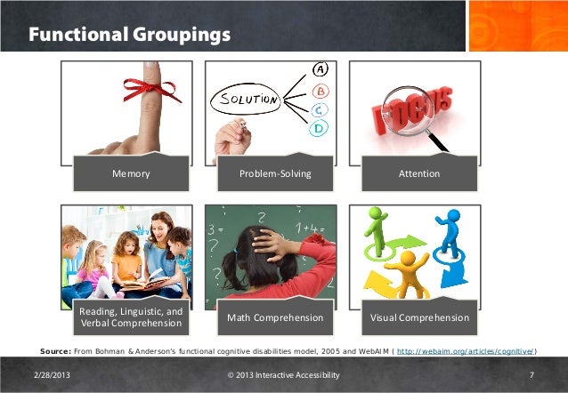 7. 7. Functional Groupings Memory Problem-Solving Attention Reading, Linguistic, and Math Comprehension Visual Comprehension Verbal Comprehension Source: From Bohman & Anderson’s functional cognitive disabilities model, 2005 and WebAIM ( http://webaim.org/articles/cognitive/)2/28/2013 © 2013 Interactive Accessibility 7