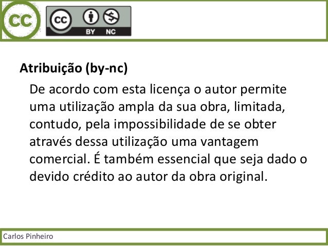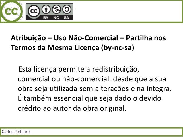 10. 10. Atribuição – Uso Não-Comercial – Partilha nos Termos da Mesma Licença (by-nc-sa) Esta licença permite a redistribuição, comercial ou não-comercial, desde que a sua obra seja utilizada sem alterações e na íntegra. É também essencial que seja dado o devido crédito ao autor da obra original. Carlos Pinheiro