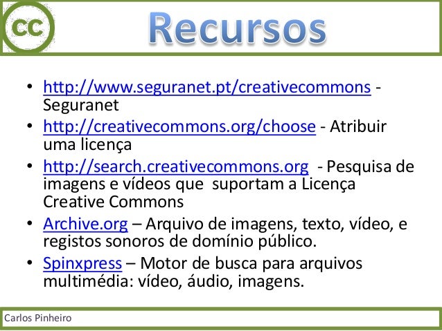 12. 12. • http://www.seguranet.pt/creativecommons Seguranet • http://creativecommons.org/choose - Atribuir uma licença • http://search.creativecommons.org - Pesquisa de imagens e vídeos que suportam a Licença Creative Commons • Archive.org – Arquivo de imagens, texto, vídeo, e registos sonoros de domínio público. • Spinxpress – Motor de busca para arquivos multimédia: vídeo, áudio, imagens. Carlos Pinheiro