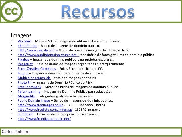13. 13. Imagens • • • • • • • • • • • • • • • • • • Worldart – Mais de 50 mil imagens de utilização livre em educação. 4FreePhotos – Banco de imagens de domínio público, http://www.veezzle.com - Motor de busca de imagens de utilização livre. http://www.publicdomainpictures.net - repositório de fotos gratuitas de domínio público Pixabay – Imagens de domínio público para projetos escolares. ImageNet – Base de dados de imagens organizadas hierarquicamente. Flickr Creative Commons – Fotos Flickr com licenças CC. Edupic – Imagens e desenhos para projetos de educação. Multicolor search lab - escolher imagens por cores Photo Pin – Imagens de Domínio Público do Flickr. FreePhotoBank – Motor de busca de imagens de domínio público. Ppics4learning – Imagens de Domínio Público para educação. Morguefile – Fotografias grátis de alta resolução. Public Domain Image – Banco de imagens de domínio público. http://www.freeimages.co.uk - 13,500 Free Stock Photos http://www.freefoto.com/index.jsp - 132549 imagens cCmpfight – Ferramenta de pesquisa no Flickr search. http://www.freedigitalphotos.net/ Carlos Pinheiro