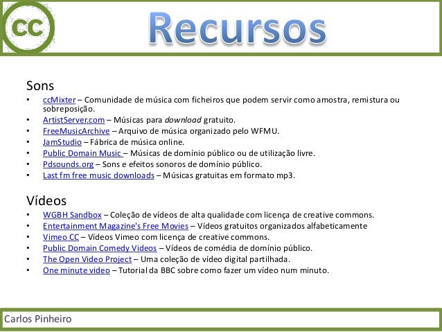 14. 14. Sons • • • • • • • ccMixter – Comunidade de música com ficheiros que podem servir como amostra, remistura ou sobreposição. ArtistServer.com – Músicas para download gratuito. FreeMusicArchive – Arquivo de música organizado pelo WFMU. JamStudio – Fábrica de música online. Public Domain Music – Músicas de domínio público ou de utilização livre. Pdsounds.org – Sons e efeitos sonoros de domínio público. Last fm free music downloads – Músicas gratuitas em formato mp3. Vídeos • • • • • • WGBH Sandbox – Coleção de vídeos de alta qualidade com licença de creative commons. Entertainment Magazine's Free Movies – Vídeos gratuitos organizados alfabeticamente Vimeo CC – Vídeos Vimeo com licença de creative commons. Public Domain Comedy Videos – Vídeos de comédia de domínio público. The Open Video Project – Uma coleção de vídeo digital partilhada. One minute video – Tutorial da BBC sobre como fazer um vídeo num minuto. Carlos Pinheiro