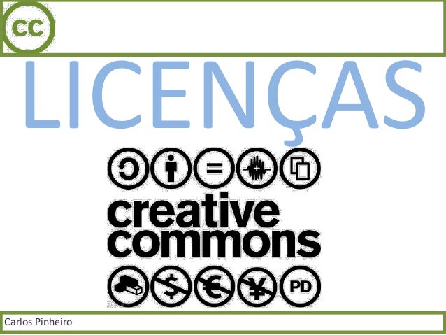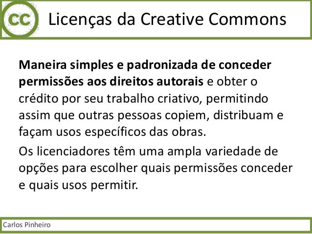 5. 5. Licenças da Creative Commons Maneira simples e padronizada de conceder permissões aos direitos autorais e obter o crédito por seu trabalho criativo, permitindo assim que outras pessoas copiem, distribuam e façam usos específicos das obras. Os licenciadores têm uma ampla variedade de opções para escolher quais permissões conceder e quais usos permitir. Carlos Pinheiro