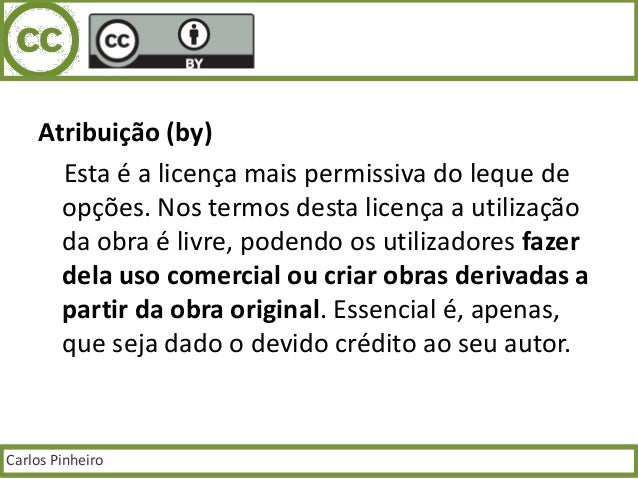 6. 6. Atribuição (by) Esta é a licença mais permissiva do leque de opções. Nos termos desta licença a utilização da obra é livre, podendo os utilizadores fazer dela uso comercial ou criar obras derivadas a partir da obra original. Essencial é, apenas, que seja dado o devido crédito ao seu autor. Carlos Pinheiro