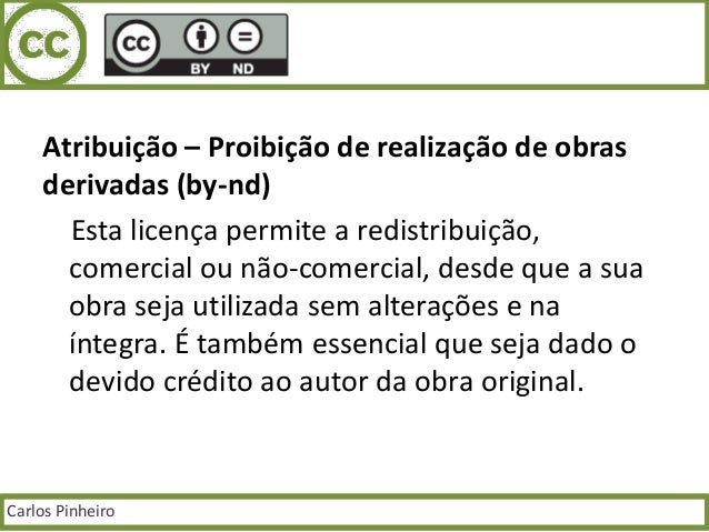 7. 7. Atribuição – Proibição de realização de obras derivadas (by-nd) Esta licença permite a redistribuição, comercial ou não-comercial, desde que a sua obra seja utilizada sem alterações e na íntegra. É também essencial que seja dado o devido crédito ao autor da obra original. Carlos Pinheiro