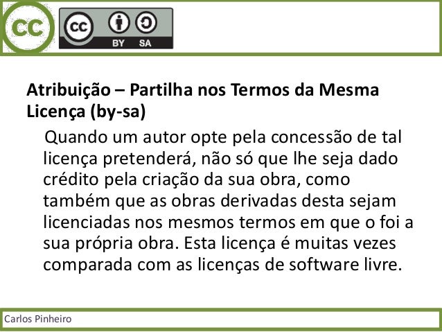 8. 8. Atribuição – Partilha nos Termos da Mesma Licença (by-sa) Quando um autor opte pela concessão de tal licença pretenderá, não só que lhe seja dado crédito pela criação da sua obra, como também que as obras derivadas desta sejam licenciadas nos mesmos termos em que o foi a sua própria obra. Esta licença é muitas vezes comparada com as licenças de software livre. Carlos Pinheiro