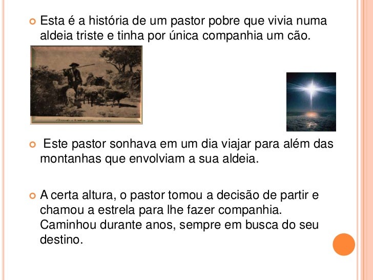 2. 2. Esta é a história de um pastor pobre que vivia numa aldeia triste e tinha por única companhia um cão.<br /> Este pastor sonhava em um dia viajar para além das montanhas que envolviam a sua aldeia.<br />A certa altura, o pastor tomou a decisão de partir e chamou a estrela para lhe fazer companhia. Caminhou durante anos, sempre em busca do seu destino.<br />