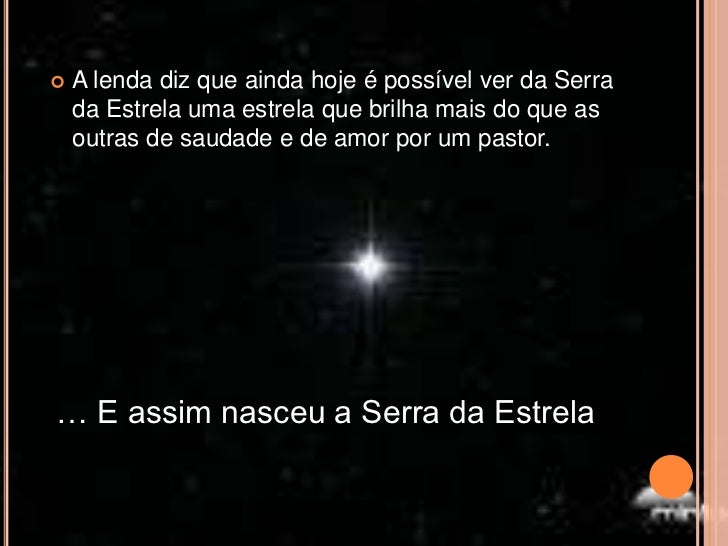 5. 5. A lenda diz que ainda hoje é possível ver da Serra da Estrela uma estrela que brilha mais do que as outras de saudade e de amor por um pastor.<br />… E assim nasceu a Serra da Estrela<br />