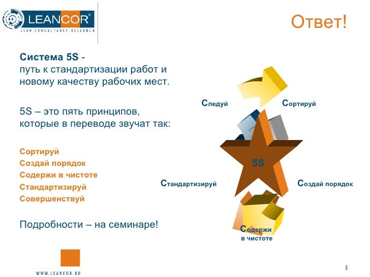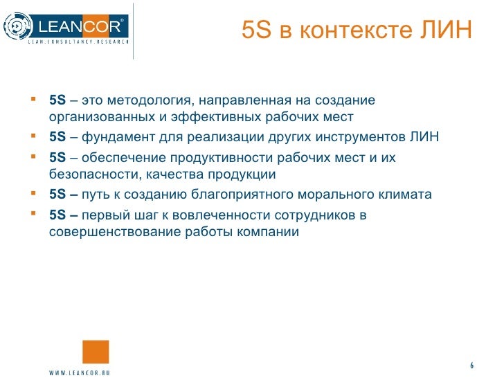 Внедрение системы 5S действительно дает множество положительных эффектов в различных областях: для эффективности рабочих мест, для их безопасности, для обеспечения качества продукции/услуг. Мы покажем вам почему 5S обязательно лежит в основе ЛИН.