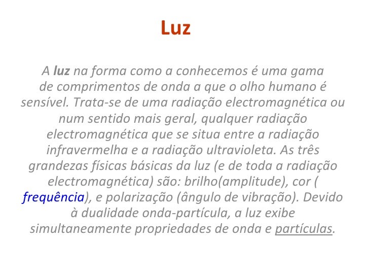 2. 2. Luz A  luz  na forma como a conhecemos é uma gama de comprimentos de onda a que o olho humano é sensível. Trata-se de uma radiação electromagnética ou num sentido mais geral, qualquer radiação electromagnética que se situa entre a radiação infravermelha e a radiação ultravioleta. As três grandezas físicas básicas da luz (e de toda a radiação electromagnética) são: brilho(amplitude), cor ( frequência ), e polarização (ângulo de vibração). Devido à dualidade onda-partícula, a luz exibe simultaneamente propriedades de onda e  partículas .