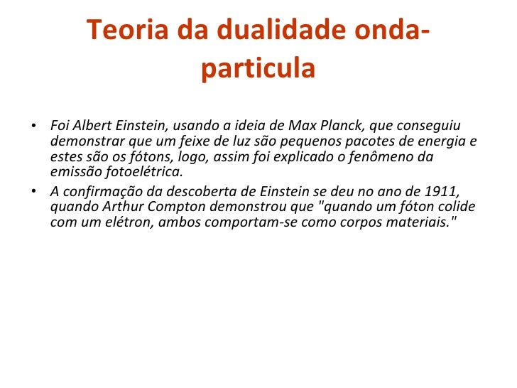 4. 5. Teoria da dualidade onda-particula <ul><li>Foi Albert Einstein, usando a ideia de Max Planck, que conseguiu demonstrar que um feixe de luz são pequenos pacotes de energia e estes são os fótons, logo, assim foi explicado o fenômeno da emissão fotoelétrica. </li></ul><ul><li>A confirmação da descoberta de Einstein se deu no ano de 1911, quando Arthur Compton demonstrou que &quot;quando um fóton colide com um elétron, ambos comportam-se como corpos materiais.&quot; </li></ul>