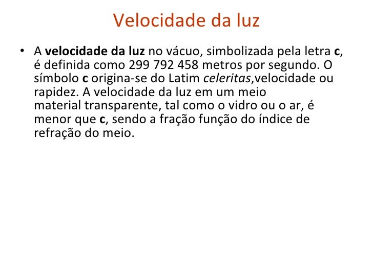 5. 6. Velocidade da luz <ul><li>A  velocidade da luz  no vácuo, simbolizada pela letra  c , é definida como 299 792 458 metros por segundo. O símbolo  c  origina-se do Latim  celeritas ,velocidade ou rapidez. A velocidade da luz em um meio material transparente, tal como o vidro ou o ar, é menor que  c , sendo a fração função do índice de refração do meio. </li></ul>