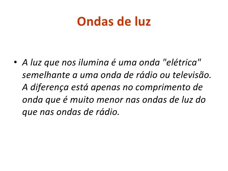 6. 7. Ondas de luz <ul><li>A luz que nos ilumina é uma onda &quot;elétrica&quot; semelhante a uma onda de rádio ou televisão. A diferença está apenas no comprimento de onda que é muito menor nas ondas de luz do que nas ondas de rádio. </li></ul>