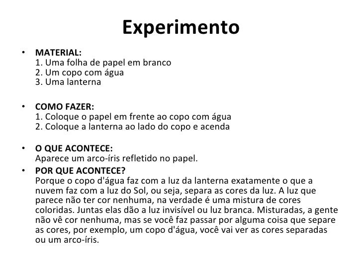 7. 9. Experimento <ul><li>MATERIAL: 1. Uma folha de papel em branco 2. Um copo com água 3. Uma lanterna </li></ul><ul><li>COMO FAZER: 1. Coloque o papel em frente ao copo com água 2. Coloque a lanterna ao lado do copo e acenda  </li></ul><ul><li>O QUE ACONTECE: Aparece um arco-íris refletido no papel. </li></ul><ul><li>POR QUE ACONTECE?  Porque o copo d'água faz com a luz da lanterna exatamente o que a nuvem faz com a luz do Sol, ou seja, separa as cores da luz. A luz que parece não ter cor nenhuma, na verdade é uma mistura de cores coloridas. Juntas elas dão a luz invisível ou luz branca. Misturadas, a gente não vê cor nenhuma, mas se você faz passar por alguma coisa que separe as cores, por exemplo, um copo d'água, você vai ver as cores separadas ou um arco-íris. </li></ul>