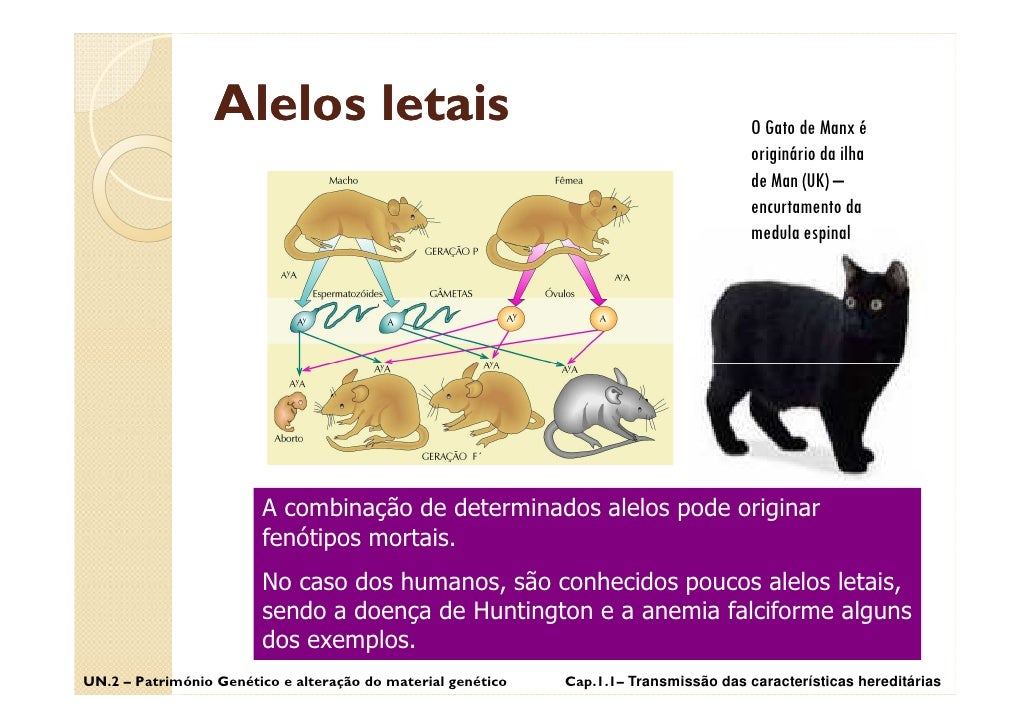 10. 10. Alelos letais O Gato de Manx é originário da ilha de Man (UK) – encurtamento da medula espinal A combinação de determinados alelos pode originar fenótipos mortais. No caso dos humanos, são conhecidos poucos alelos letais, sendo a doença de Huntington e a anemia falciforme alguns dos exemplos. UN.2 – Património Genético e alteração do material genético Cap.1.1– Transmissão das características hereditárias