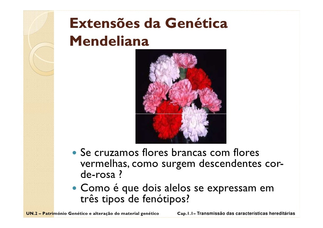 2. 2. Extensões da Genética Mendeliana Se cruzamos flores brancas com flores vermelhas, como surgem descendentes cor- de-rosa ? Como é que dois alelos se expressam em três tipos de fenótipos? UN.2 – Património Genético e alteração do material genético Cap.1.1– Transmissão das características hereditárias