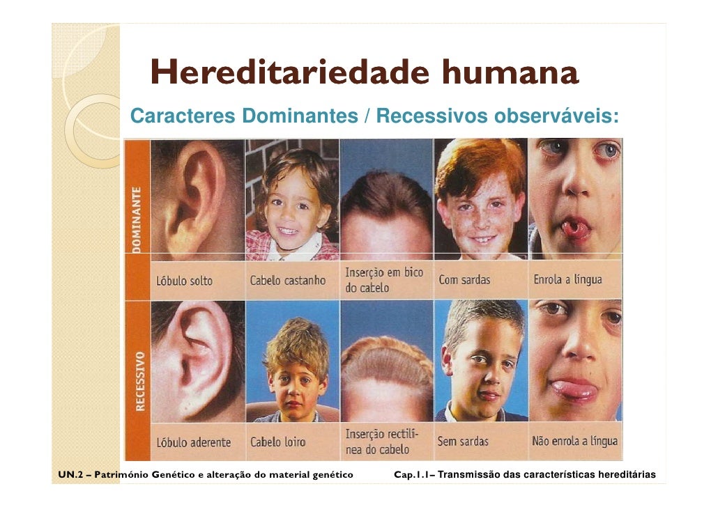 32. 32. Hereditariedade humana Caracteres Dominantes / Recessivos observáveis: UN.2 – Património Genético e alteração do material genético Cap.1.1– Transmissão das características hereditárias