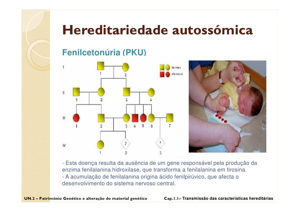 40. 40. Hereditariedade autossómica Fenilcetonúria (PKU) - Esta doença resulta da ausência de um gene responsável pela produção da enzima fenilalanina hidroxilase, que transforma a fenilalanina em tirosina. - A acumulação de fenilalanina origina ácido fenilpirúvico, que afecta o desenvolvimento do sistema nervoso central. UN.2 – Património Genético e alteração do material genético Cap.1.1– Transmissão das características hereditárias
