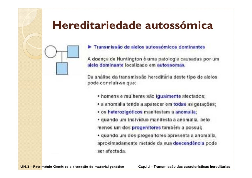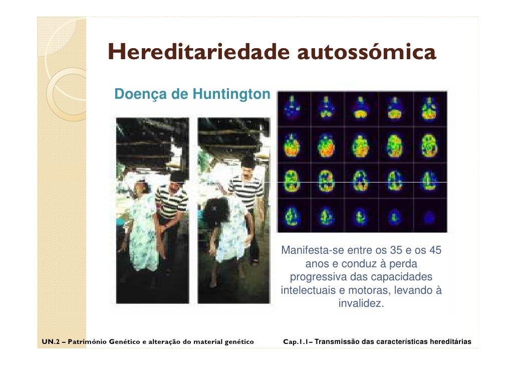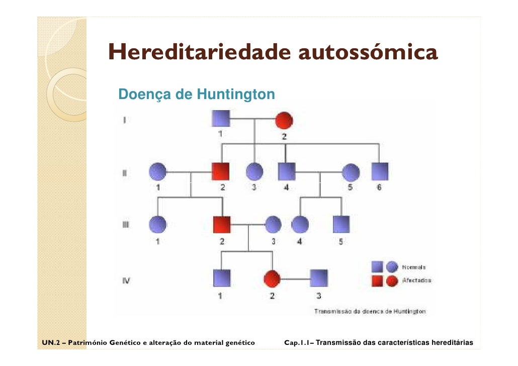 43. 43. Hereditariedade autossómica Doença de Huntington UN.2 – Património Genético e alteração do material genético Cap.1.1– Transmissão das características hereditárias