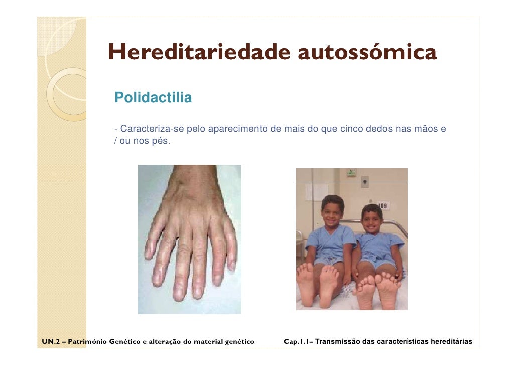 44. 44. Hereditariedade autossómica Polidactilia - Caracteriza-se pelo aparecimento de mais do que cinco dedos nas mãos e / ou nos pés. UN.2 – Património Genético e alteração do material genético Cap.1.1– Transmissão das características hereditárias