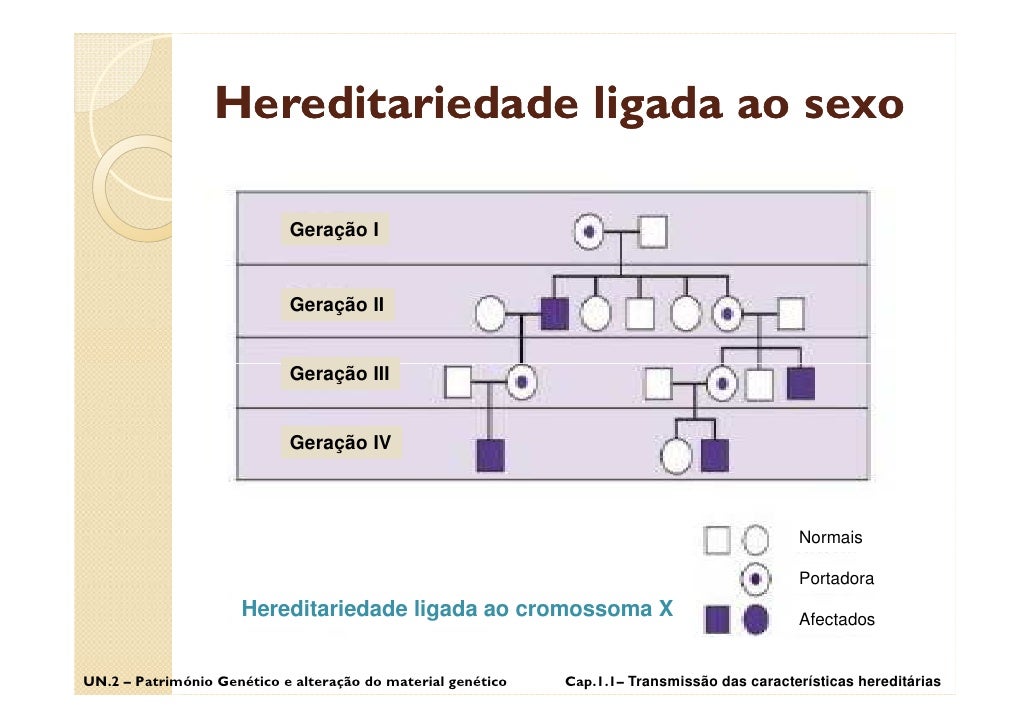 47. 47. Hereditariedade ligada ao sexo Geração I Geração II Geração III Geração IV Normais Portadora Hereditariedade ligada ao cromossoma X Afectados UN.2 – Património Genético e alteração do material genético Cap.1.1– Transmissão das características hereditárias