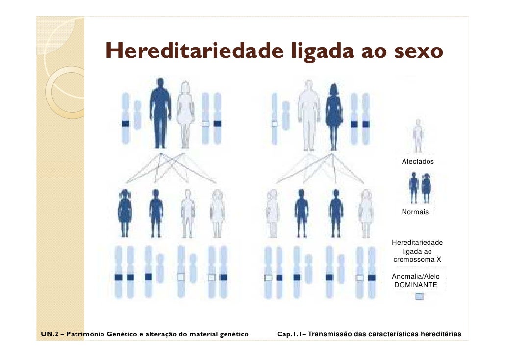49. 49. Hereditariedade ligada ao sexo Afectados Normais Hereditariedade ligada ao cromossoma X Anomalia/Alelo DOMINANTE UN.2 – Património Genético e alteração do material genético Cap.1.1– Transmissão das características hereditárias