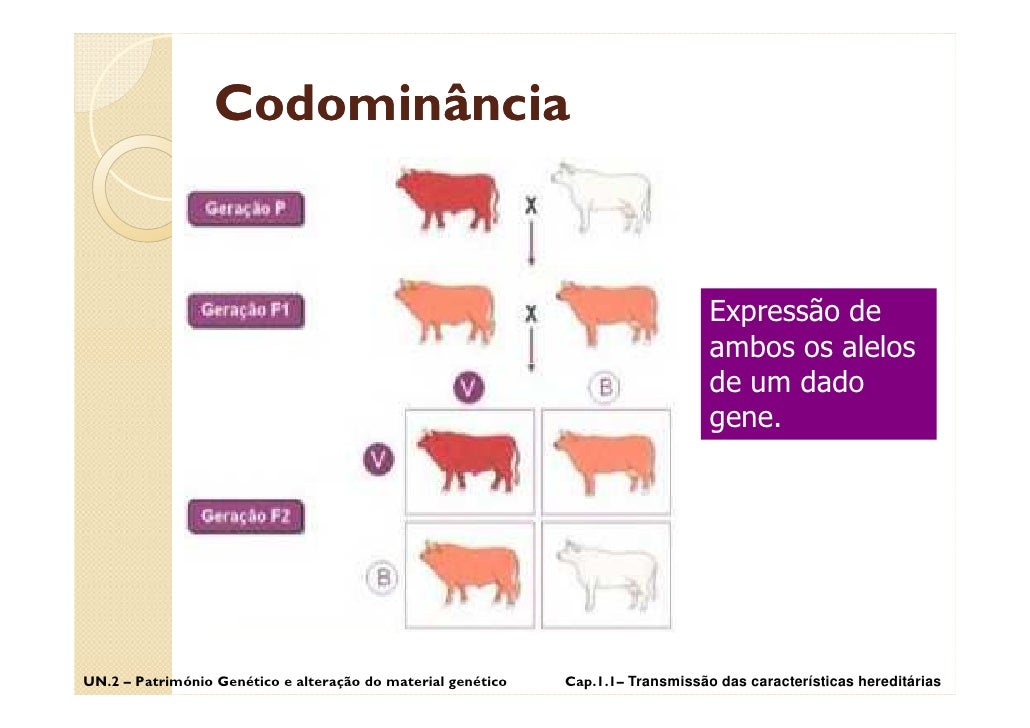 5. 5. Codominância Expressão de ambos os alelos de um dado gene. UN.2 – Património Genético e alteração do material genético Cap.1.1– Transmissão das características hereditárias