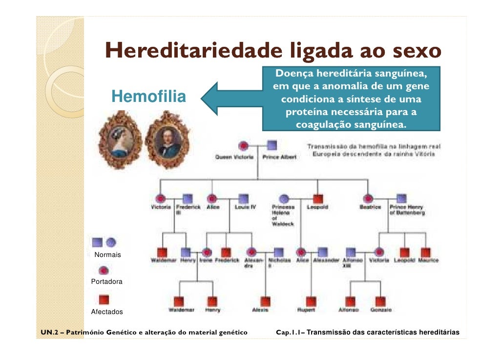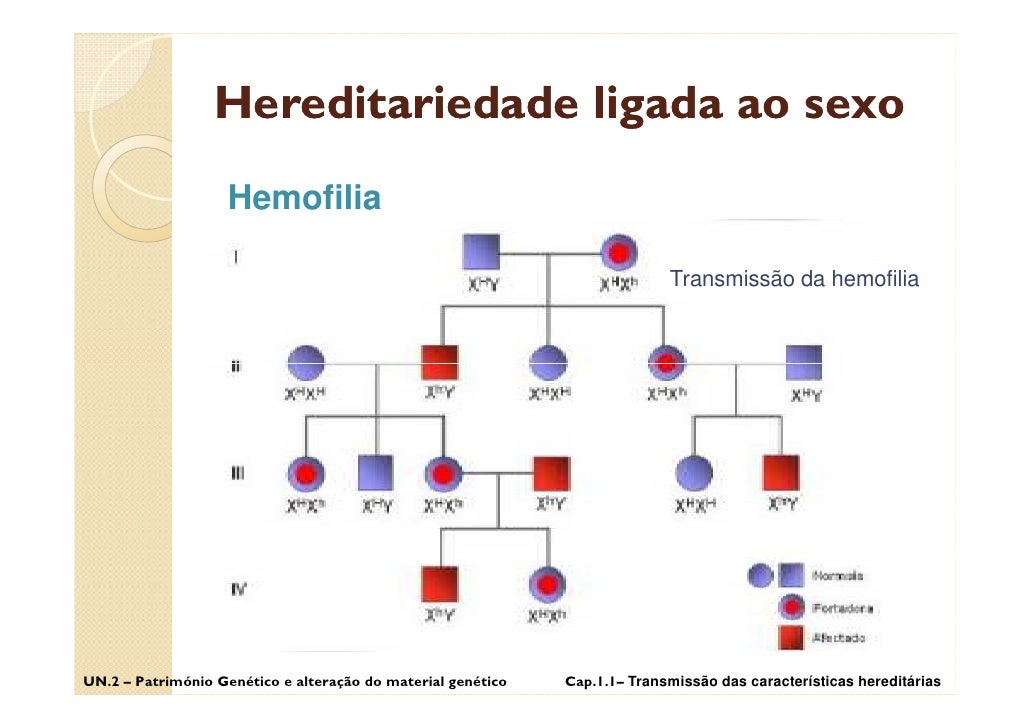 54. 54. Hereditariedade ligada ao sexo Hemofilia Transmissão da hemofilia UN.2 – Património Genético e alteração do material genético Cap.1.1– Transmissão das características hereditárias