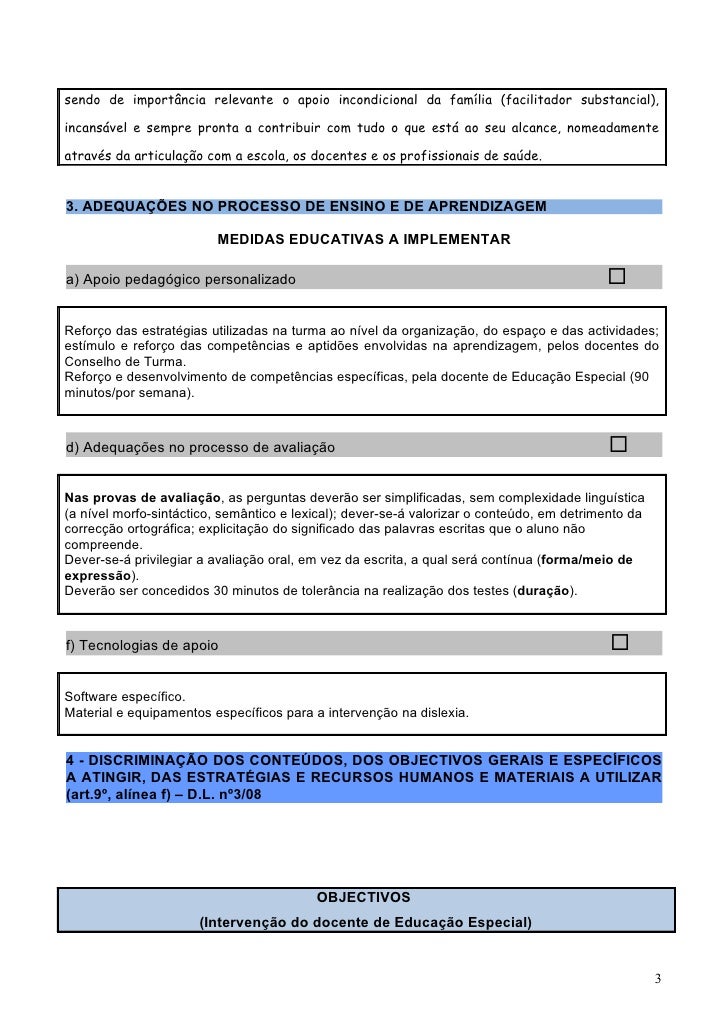 3. 3. sendo de importância relevante o apoio incondicional da família (facilitador substancial),incansável e sempre pronta a contribuir com tudo o que está ao seu alcance, nomeadamenteatravés da articulação com a escola, os docentes e os profissionais de saúde.3. ADEQUAÇÕES NO PROCESSO DE ENSINO E DE APRENDIZAGEM MEDIDAS EDUCATIVAS A IMPLEMENTARa) Apoio pedagógico personalizado Reforço das estratégias utilizadas na turma ao nível da organização, do espaço e das actividades;estímulo e reforço das competências e aptidões envolvidas na aprendizagem, pelos docentes doConselho de Turma.Reforço e desenvolvimento de competências específicas, pela docente de Educação Especial (90minutos/por semana).d) Adequações no processo de avaliação Nas provas de avaliação, as perguntas deverão ser simplificadas, sem complexidade linguística(a nível morfo-sintáctico, semântico e lexical); dever-se-á valorizar o conteúdo, em detrimento dacorrecção ortográfica; explicitação do significado das palavras escritas que o aluno nãocompreende.Dever-se-á privilegiar a avaliação oral, em vez da escrita, a qual será contínua (forma/meio deexpressão).Deverão ser concedidos 30 minutos de tolerância na realização dos testes (duração).f) Tecnologias de apoio Software específico.Material e equipamentos específicos para a intervenção na dislexia.4 - DISCRIMINAÇÃO DOS CONTEÚDOS, DOS OBJECTIVOS GERAIS E ESPECÍFICOSA ATINGIR, DAS ESTRATÉGIAS E RECURSOS HUMANOS E MATERIAIS A UTILIZAR(art.9º, alínea f) – D.L. nº3/08 OBJECTIVOS (Intervenção do docente de Educação Especial) 3