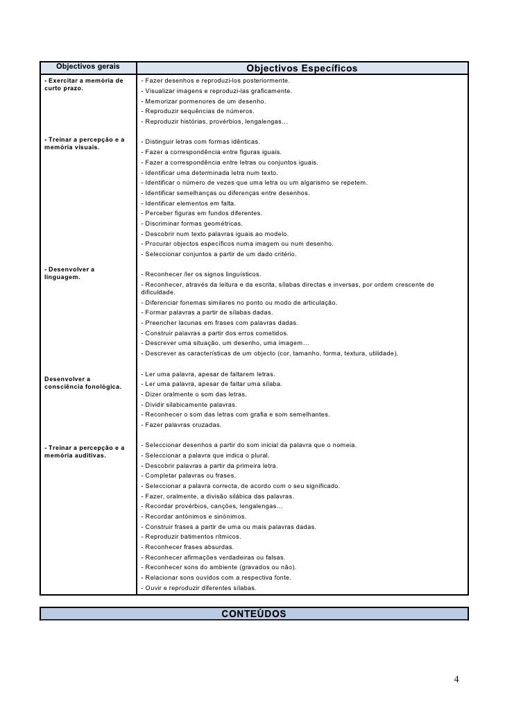 4. 4. Objectivos gerais Objectivos Específicos- Exercitar a memória de - Fazer desenhos e reproduzi-los posteriormente.curto prazo. - Visualizar imagens e reproduzi-las graficamente. - Memorizar pormenores de um desenho. - Reproduzir sequências de números. - Reproduzir histórias, provérbios, lengalengas…- Treinar a percepção e a - Distinguir letras com formas idênticas.memória visuais. - Fazer a correspondência entre figuras iguais. - Fazer a correspondência entre letras ou conjuntos iguais. - Identificar uma determinada letra num texto. - Identificar o número de vezes que uma letra ou um algarismo se repetem. - Identificar semelhanças ou diferenças entre desenhos. - Identificar elementos em falta. - Perceber figuras em fundos diferentes. - Discriminar formas geométricas. - Descobrir num texto palavras iguais ao modelo. - Procurar objectos específicos numa imagem ou num desenho. - Seleccionar conjuntos a partir de um dado critério.- Desenvolver alinguagem. - Reconhecer /ler os signos linguísticos. - Reconhecer, através da leitura e da escrita, sílabas directas e inversas, por ordem crescente de dificuldade. - Diferenciar fonemas similares no ponto ou modo de articulação. - Formar palavras a partir de sílabas dadas. - Preencher lacunas em frases com palavras dadas. - Construir palavras a partir dos erros cometidos. - Descrever uma situação, um desenho, uma imagem… - Descrever as características de um objecto (cor, tamanho, forma, textura, utilidade). - Ler uma palavra, apesar de faltarem letras.Desenvolver aconsciência fonológica. - Ler uma palavra, apesar de faltar uma sílaba. - Dizer oralmente o som das letras. - Dividir silabicamente palavras. - Reconhecer o som das letras com grafia e som semelhantes. - Fazer palavras cruzadas.- Treinar a percepção e a - Seleccionar desenhos a partir do som inicial da palavra que o nomeia.memória auditivas. - Seleccionar a palavra que indica o plural. - Descobrir palavras a partir da primeira letra. - Completar palavras ou frases. - Seleccionar a palavra correcta, de acordo com o seu significado. - Fazer, oralmente, a divisão silábica das palavras. - Recordar provérbios, canções, lengalengas… - Recordar antónimos e sinónimos. - Construir frases a partir de uma ou mais palavras dadas. - Reproduzir batimentos rítmicos. - Reconhecer frases absurdas. - Reconhecer afirmações verdadeiras ou falsas. - Reconhecer sons do ambiente (gravados ou não). - Relacionar sons ouvidos com a respectiva fonte. - Ouvir e reproduzir diferentes sílabas. CONTEÚDOS 4