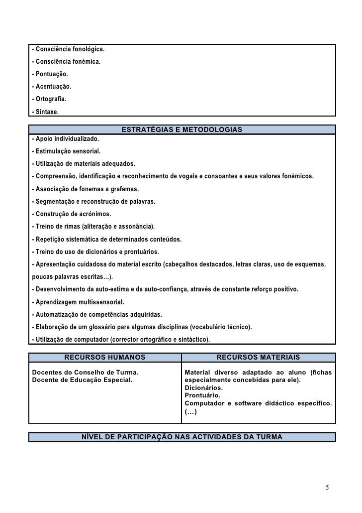 5. 5. - Consciência fonológica.- Consciência fonémica.- Pontuação.- Acentuação.- Ortografia.- Sintaxe. ESTRATÉGIAS E METODOLOGIAS- Apoio individualizado.- Estimulação sensorial.- Utilização de materiais adequados.- Compreensão, identificação e reconhecimento de vogais e consoantes e seus valores fonémicos.- Associação de fonemas a grafemas.- Segmentação e reconstrução de palavras.- Construção de acrónimos.- Treino de rimas (aliteração e assonância).- Repetição sistemática de determinados conteúdos.- Treino do uso de dicionários e prontuários.- Apresentação cuidadosa do material escrito (cabeçalhos destacados, letras claras, uso de esquemas,poucas palavras escritas…).- Desenvolvimento da auto-estima e da auto-confiança, através de constante reforço positivo.- Aprendizagem multissensorial.- Automatização de competências adquiridas.- Elaboração de um glossário para algumas disciplinas (vocabulário técnico).- Utilização de computador (corrector ortográfico e sintáctico). RECURSOS HUMANOS RECURSOS MATERIAISDocentes do Conselho de Turma. Material diverso adaptado ao aluno (fichasDocente de Educação Especial. especialmente concebidas para ele). Dicionários. Prontuário. Computador e software didáctico específico. (…) NÍVEL DE PARTICIPAÇÃO NAS ACTIVIDADES DA TURMA 5