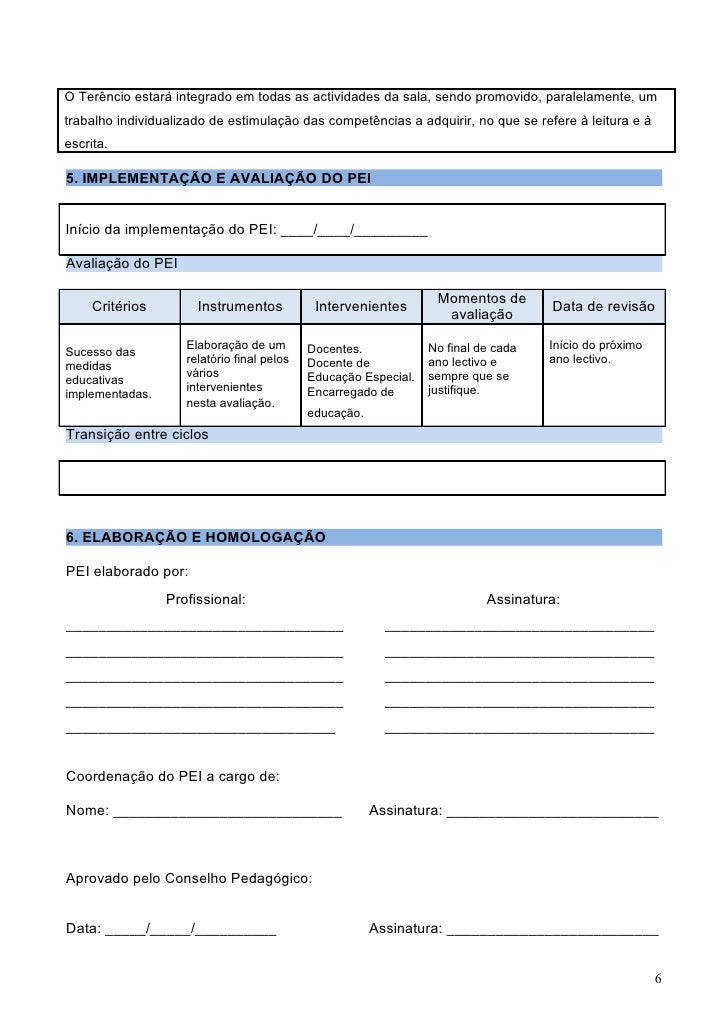 6. 6. O Terêncio estará integrado em todas as actividades da sala, sendo promovido, paralelamente, umtrabalho individualizado de estimulação das competências a adquirir, no que se refere à leitura e àescrita.5. IMPLEMENTAÇÃO E AVALIAÇÃO DO PEIInício da implementação do PEI: ____/____/_________Avaliação do PEI Momentos de Critérios Instrumentos Intervenientes Data de revisão avaliação Elaboração de um Docentes. No final de cada Início do próximoSucesso das relatório final pelos Docente de ano lectivo e ano lectivo.medidas vários Educação Especial. sempre que seeducativas intervenientes Encarregado de justifique.implementadas. nesta avaliação. educação.Transição entre ciclos6. ELABORAÇÃO E HOMOLOGAÇÃOPEI elaborado por: Profissional: Assinatura:__________________________________ ___________________________________________________________________ ___________________________________________________________________ ___________________________________________________________________ __________________________________________________________________ _________________________________Coordenação do PEI a cargo de:Nome: ____________________________ Assinatura: __________________________Aprovado pelo Conselho Pedagógico:Data: _____/_____/__________ Assinatura: __________________________ 6