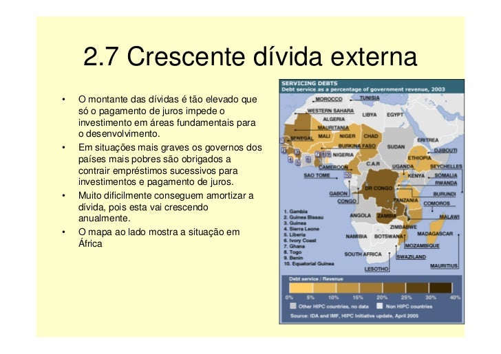 10. 10. 2.7 Crescente dívida externa • O montante das dívidas é tão elevado que só o pagamento de juros impede o investimento em áreas fundamentais para o desenvolvimento. • Em situações mais graves os governos dos países mais pobres são obrigados a contrair empréstimos sucessivos para investimentos e pagamento de juros. • Muito dificilmente conseguem amortizar a dívida, pois esta vai crescendo anualmente. • O mapa ao lado mostra a situação em África