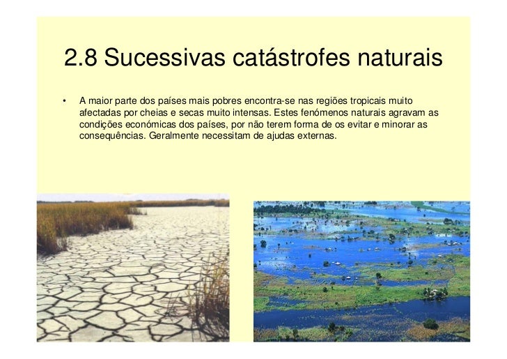 11. 11. 2.8 Sucessivas catástrofes naturais • A maior parte dos países mais pobres encontra-se nas regiões tropicais muito afectadas por cheias e secas muito intensas. Estes fenómenos naturais agravam as condições económicas dos países, por não terem forma de os evitar e minorar as consequências. Geralmente necessitam de ajudas externas.