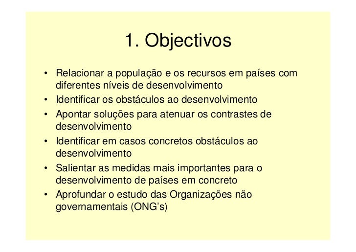 2. 2. 1. Objectivos • Relacionar a população e os recursos em países com diferentes níveis de desenvolvimento • Identificar os obstáculos ao desenvolvimento • Apontar soluções para atenuar os contrastes de desenvolvimento • Identificar em casos concretos obstáculos ao desenvolvimento • Salientar as medidas mais importantes para o desenvolvimento de países em concreto • Aprofundar o estudo das Organizações não governamentais (ONG’s)