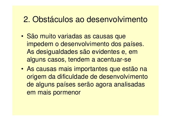 3. 3. 2. Obstáculos ao desenvolvimento • São muito variadas as causas que impedem o desenvolvimento dos países. As desigualdades são evidentes e, em alguns casos, tendem a acentuar-se • As causas mais importantes que estão na origem da dificuldade de desenvolvimento de alguns países serão agora analisadas em mais pormenor