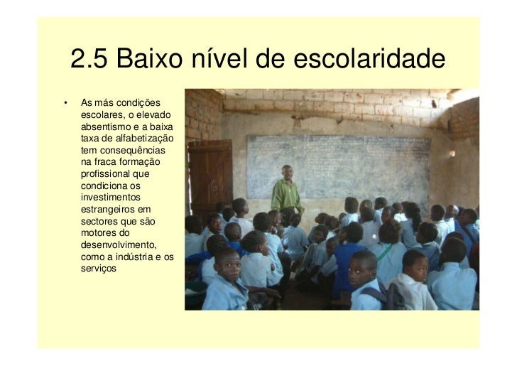 8. 8. 2.5 Baixo nível de escolaridade • As más condições escolares, o elevado absentismo e a baixa taxa de alfabetização tem consequências na fraca formação profissional que condiciona os investimentos estrangeiros em sectores que são motores do desenvolvimento, como a indústria e os serviços