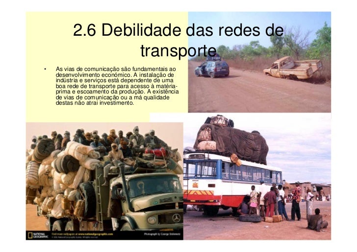 9. 9. 2.6 Debilidade das redes de transporte • As vias de comunicação são fundamentais ao desenvolvimento económico. A instalação de indústria e serviços está dependente de uma boa rede de transporte para acesso à matéria- prima e escoamento da produção. A existência de vias de comunicação ou a má qualidade destas não atrai investimento.