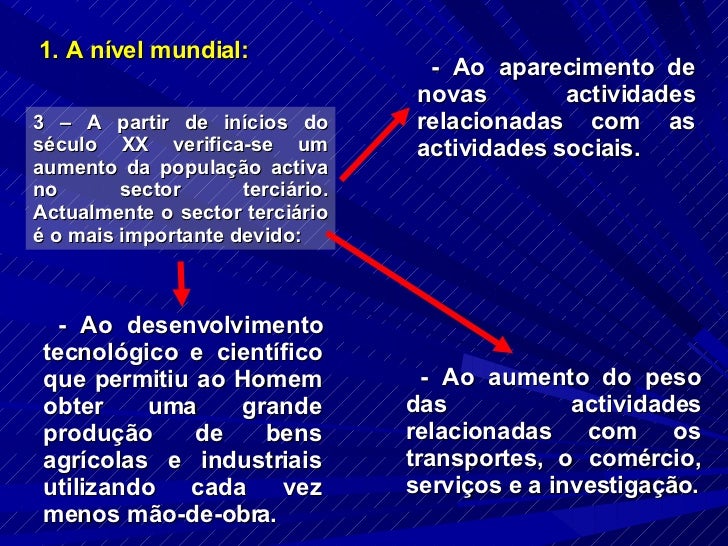 10. 10. 1. A nível mundial: 3 – A partir de inícios do século XX verifica-se um aumento da população activa no sector terciário. Actualmente o sector terciário é o mais importante devido: - Ao desenvolvimento tecnológico e científico que permitiu ao Homem obter uma grande produção de bens agrícolas e industriais utilizando cada vez menos mão-de-obra. - Ao aumento do peso das actividades relacionadas com os transportes, o comércio, serviços e a investigação. - Ao aparecimento de novas actividades relacionadas com as actividades sociais.