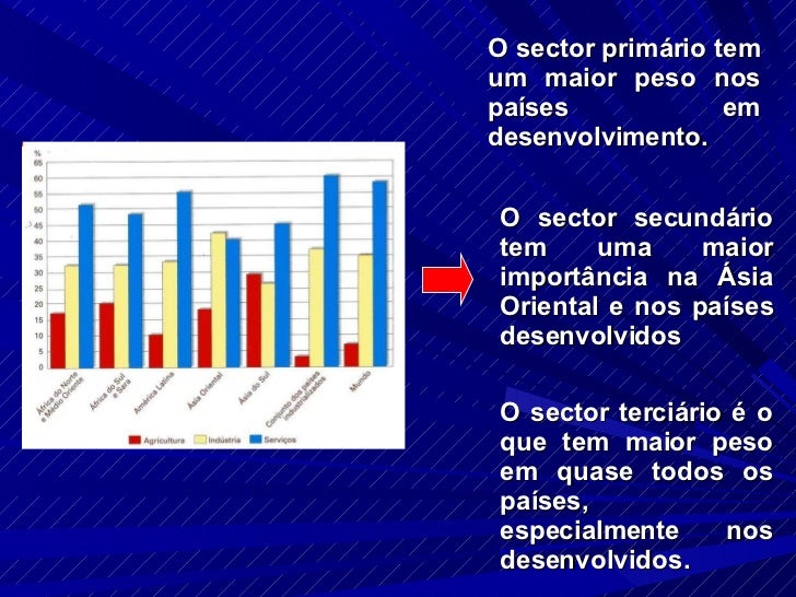11. 11. O sector primário tem um maior peso nos países em desenvolvimento. O sector secundário tem uma maior importância na Ásia Oriental e nos países desenvolvidos O sector terciário é o que tem maior peso em quase todos os países, especialmente nos desenvolvidos.